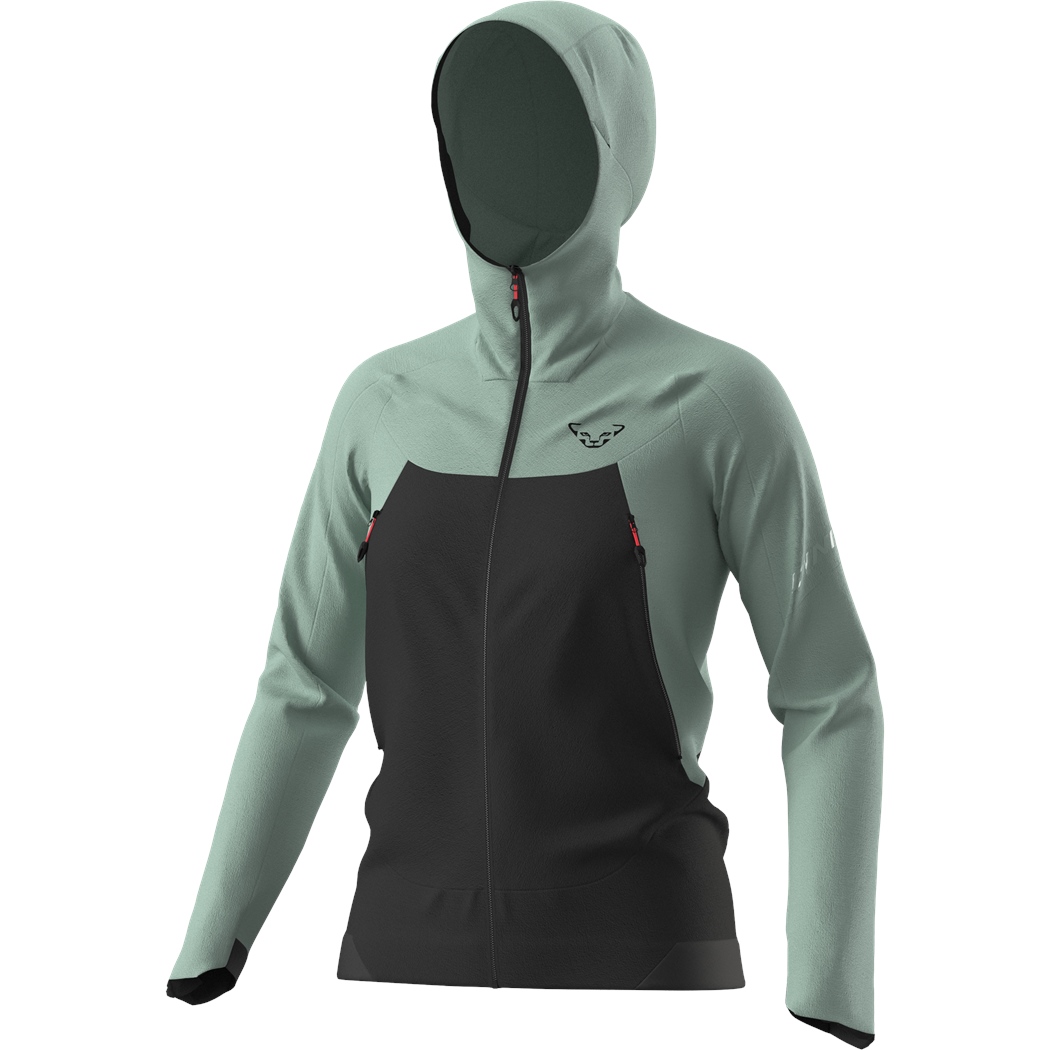 Das PFC-freie Material trägt sich sehr angenehm auf der Haut und sorgt bei schweißtreibenden Anstiegen für ein optimal reguliertes Körperklima ohne Überhitzen. Am Rücken besitzt die Jacke einen Mesh-Einsatz für zusätzliche Atmungsaktivität. Der Schnitt ist Dynafit-typisch athletisch. Elastische Bündchen an den Ärmeln und am Saum sowie die ebenfalls elastische Einfassung der Kapuze sorgen für den perfekten Sitz. In den Vordertaschen mit Reißverschluss lassen sich z.B. Schlüssel oder Handy sicher verstauen.